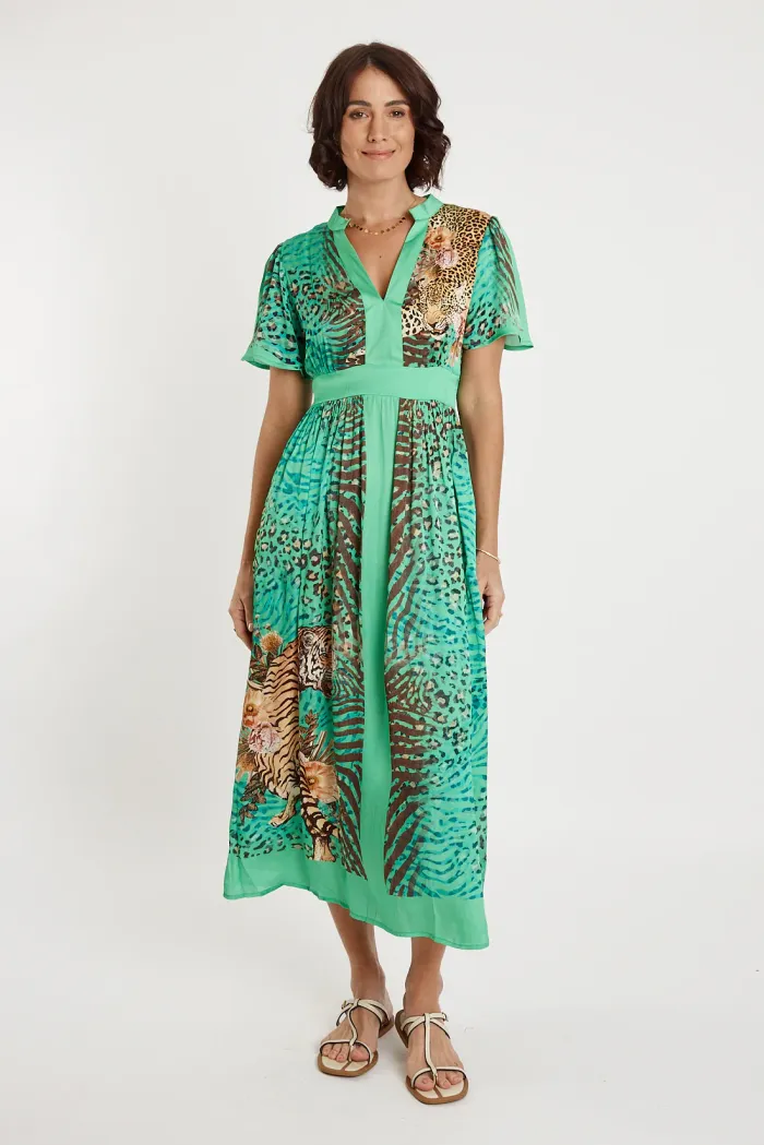 A relaxed yet elegant midi dress featuring a vibrant mix of intricate prints and rich colours. Designed with a flattering V-neckline and loose, flowy sleeves, it offers effortless comfort and an easy silhouette. The lightweight fabric drapes beautifully, making it ideal for warm days and relaxed evenings. Finished with eye-catching border details at the hem, this dress is perfect styled with sandals for daytime or dressed up with accessories for evening wear.