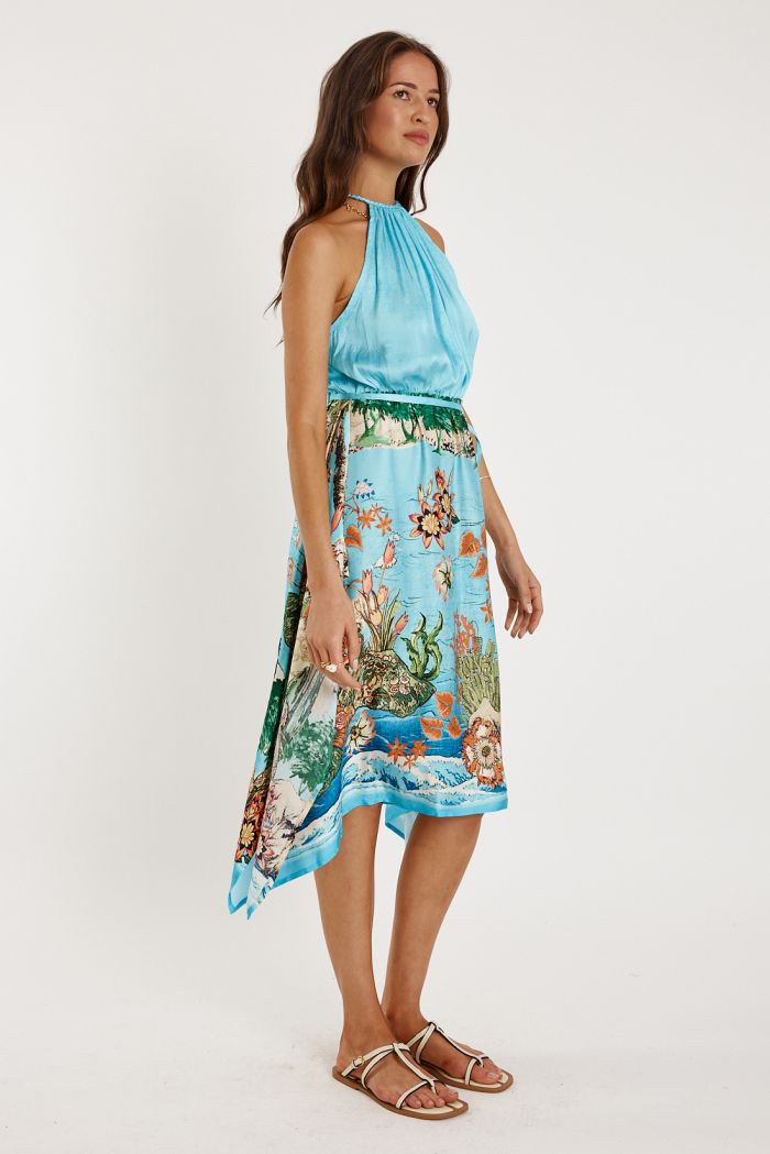 The Montpellier Halter Dress epitomises understated elegance with its luxurious 100% viscose lux construction. The distinctive halter neckline features an intricate plaited detail that draws the eye upward, while the flowing handkerchief hemline creates graceful movement with every step. Perfect for evening occasions or refined daytime wear, this piece combines timeless sophistication with contemporary design.
