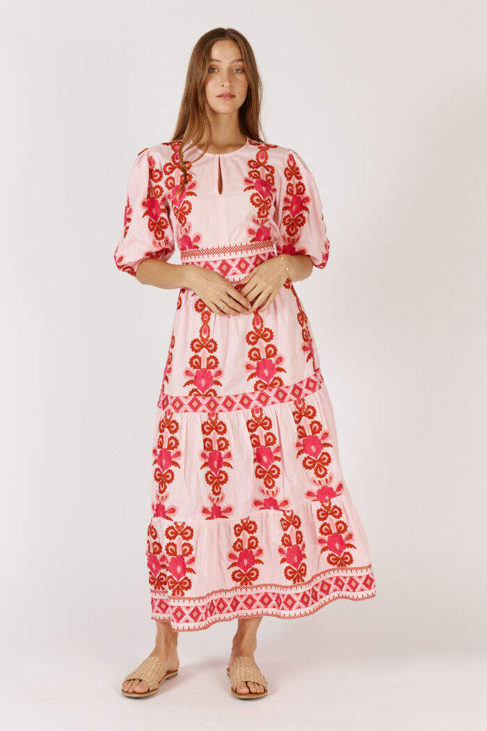 Bring on the bold with the Carlos Maxi Dress, a statement-making piece bursting with artisanal charm. Crafted in a soft pink , this dress features intricate vibrant coral and bright pink floral embroidery throughout, with voluminous puff sleeves and a tiered skirt that flows effortlessly. A delicate front keyhole detail and embroidered waistband add to its feminine flair, making it perfect for sun-soaked days and festive nights alike.