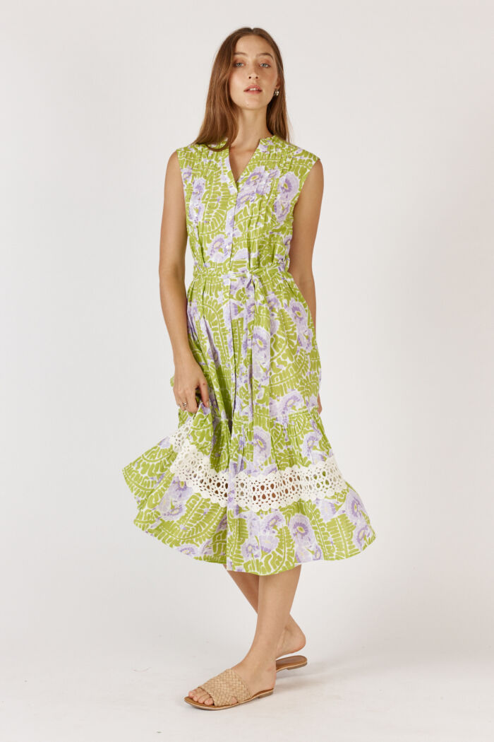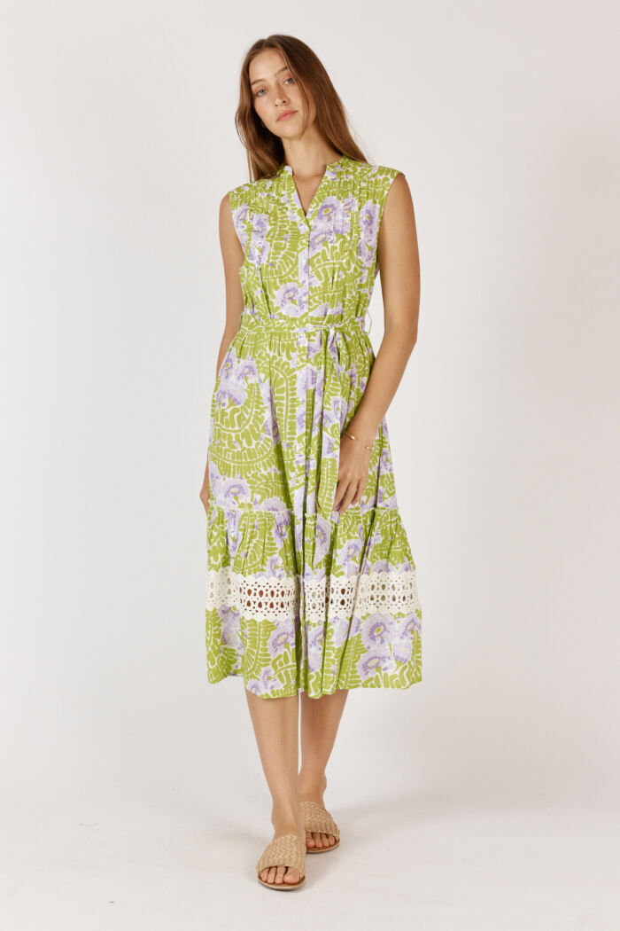 Crafted from breathable 100% cotton, this midi features a vibrant hand-block inspired floral print in shades of green and pink, designed to stand out.