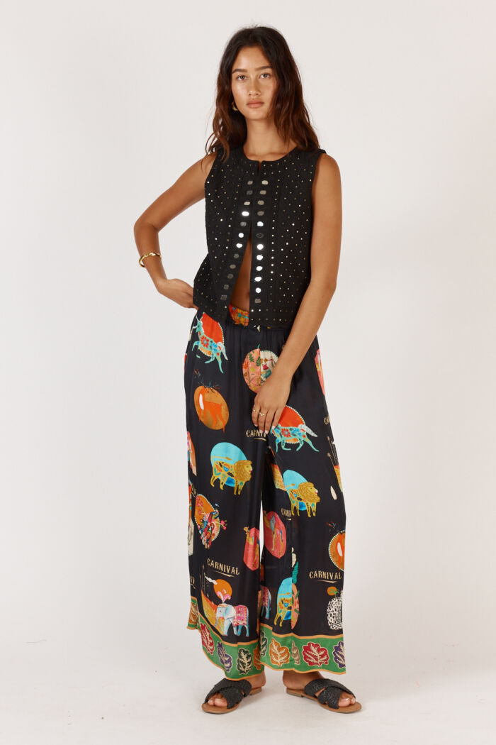 These Down Under Pants black combine effortless style with comfort. Crafted from soft viscose, they feature a flattering wide-leg silhouette and an easy pull-on design with an elastic waist. Practical side pockets and a chic button front add subtle detail, making these pants a refined choice for both casual and polished looks.