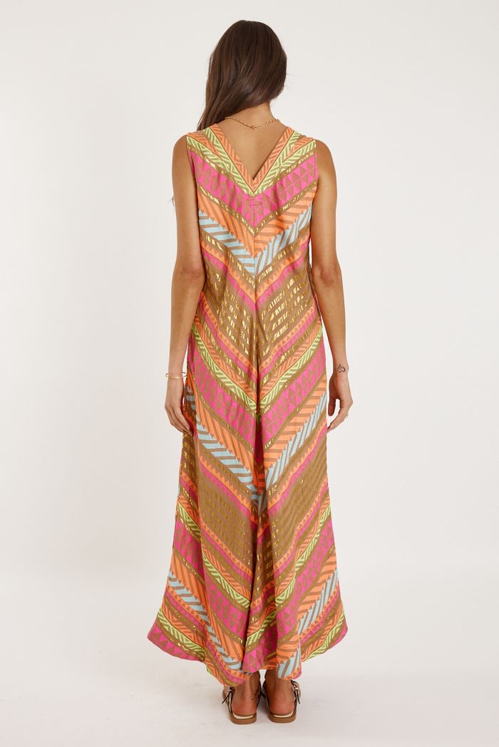 The Paloma V-Neck Maxi is crafted in a stunning, lightweight fabric and elevated with unique, intricate embroidery finished with luxurious gold detailing. The bold chevron-inspired pattern and rich, vibrant tones create a striking boho-lux look that feels effortlessly glamorous.